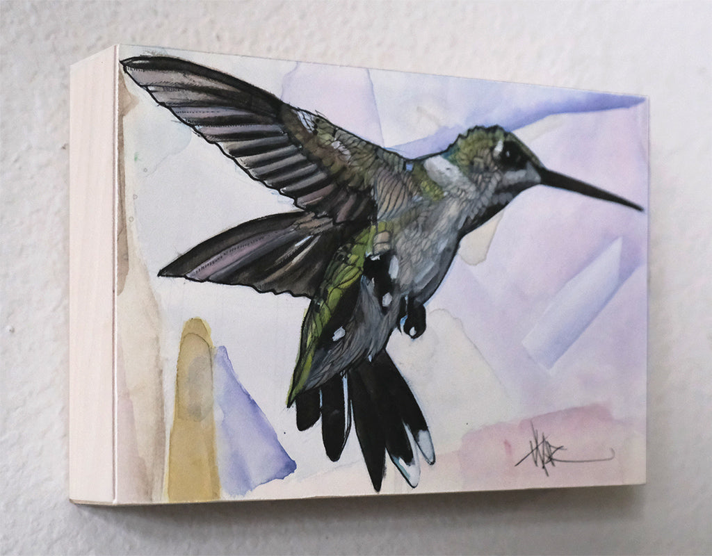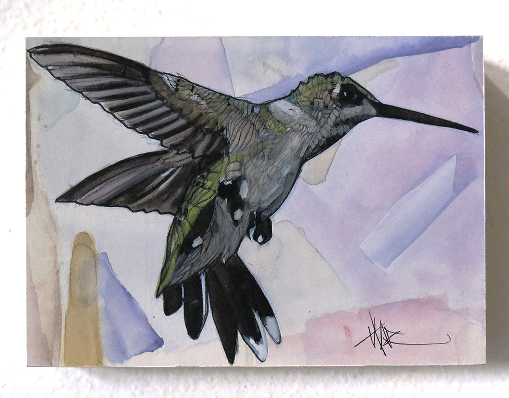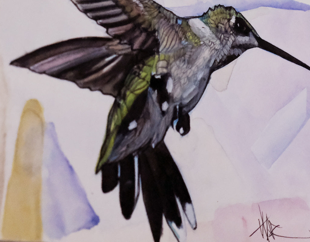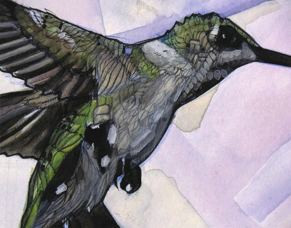 Hummingbird illustration drawn in India ink and colored with watercolor on cold press watercolor paper.