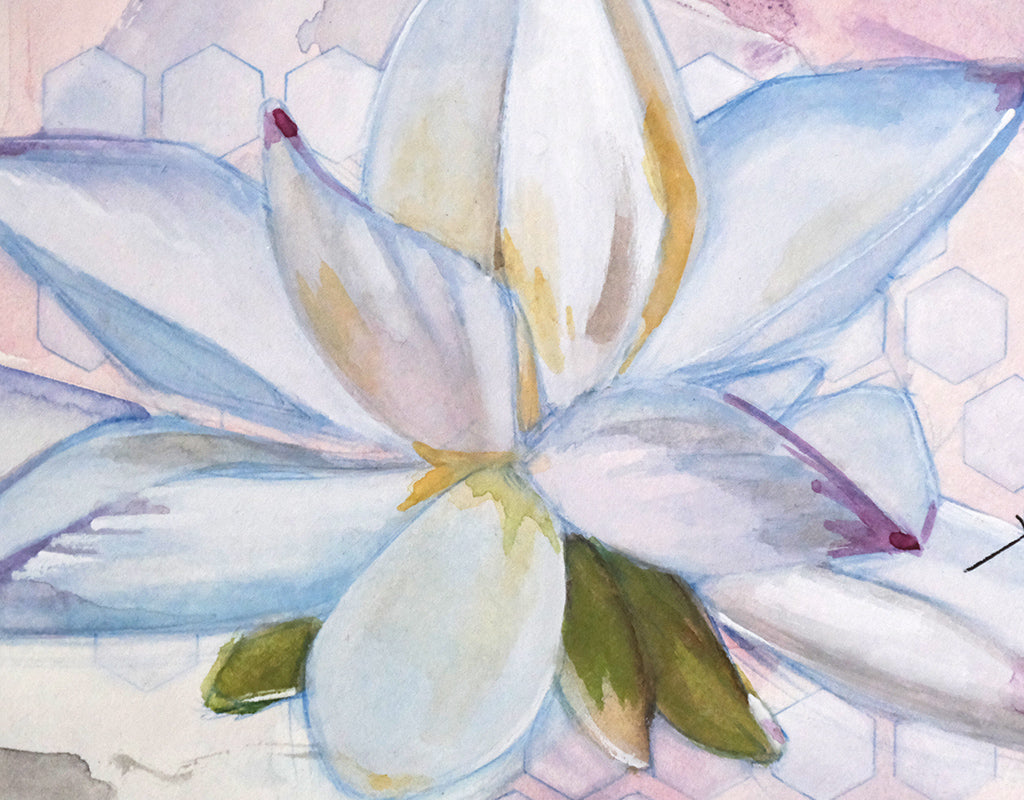 Lotus flower illustration drawn in India ink and colored with watercolor on cold press watercolor paper.