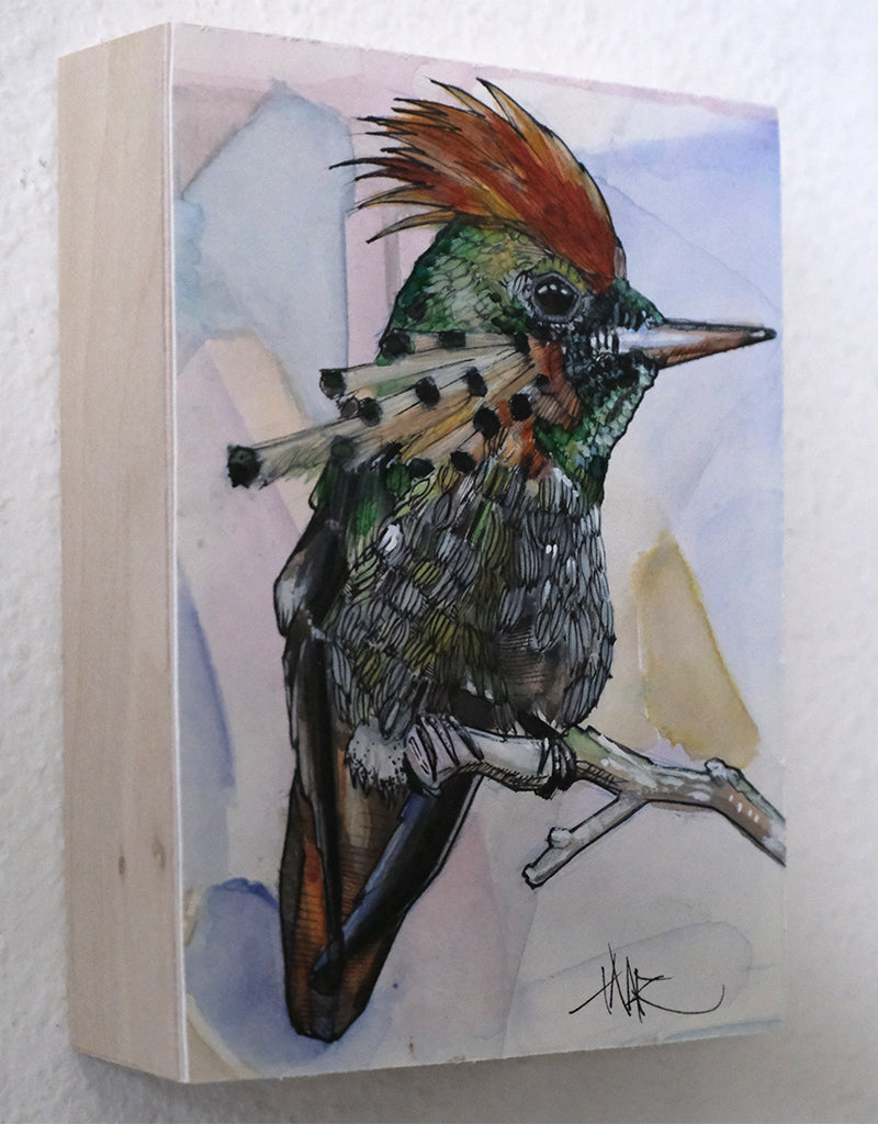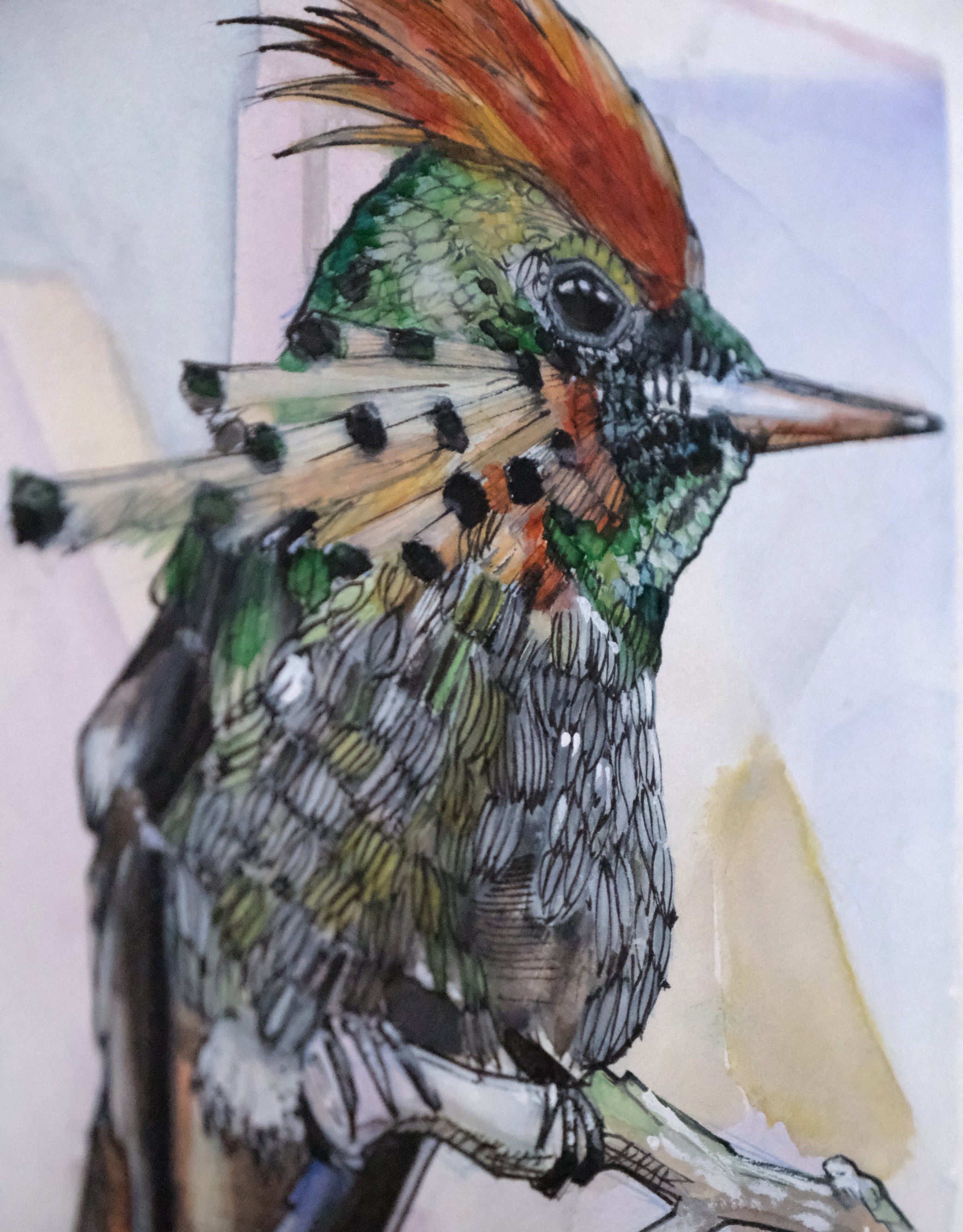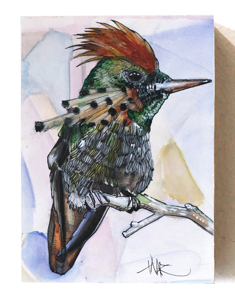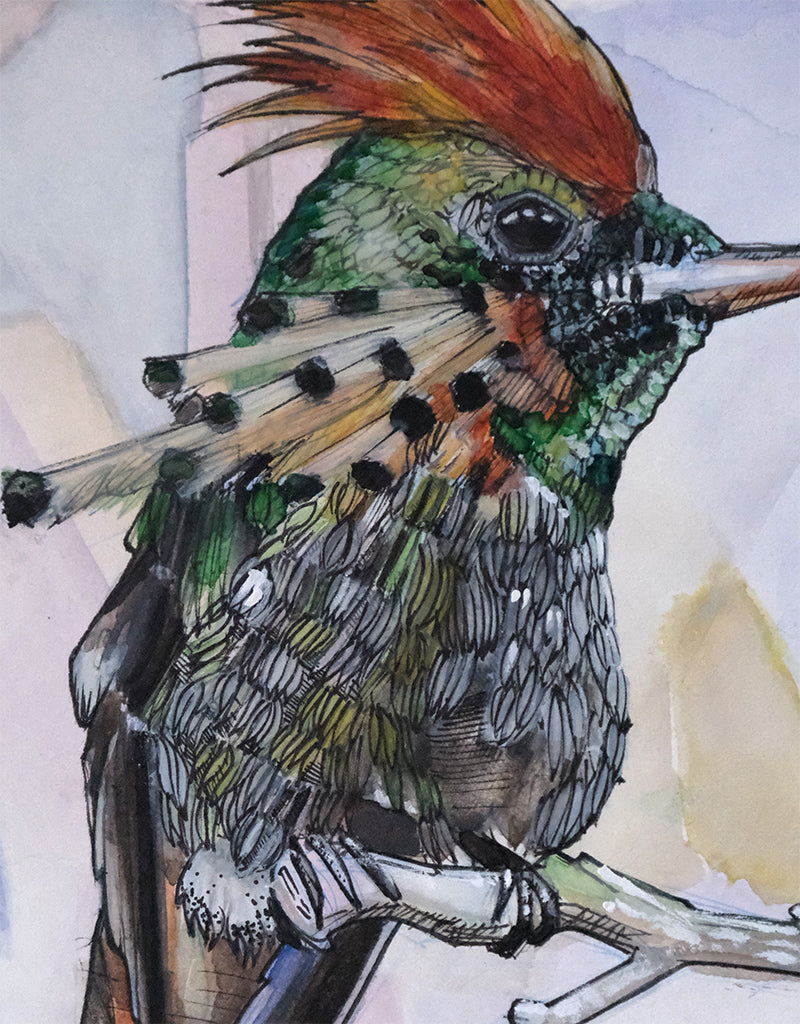 Tufted coquette hummingbird illustration drawn in India ink and colored with watercolor on cold press watercolor paper.