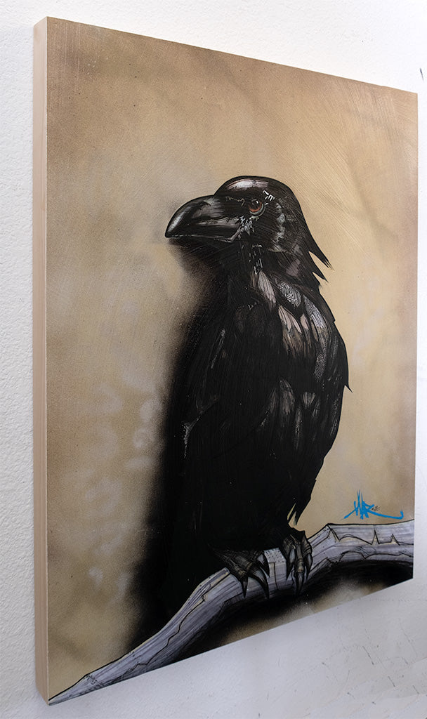 "Crow Totem" mounted on cradled wood panel. The reproductions are hand embellished with an acrylic medium for finish and protection and are ready to hang. All mounted reproductions are limited edition, signed and numbered by the artist.