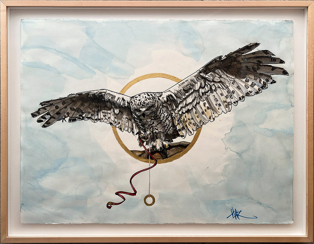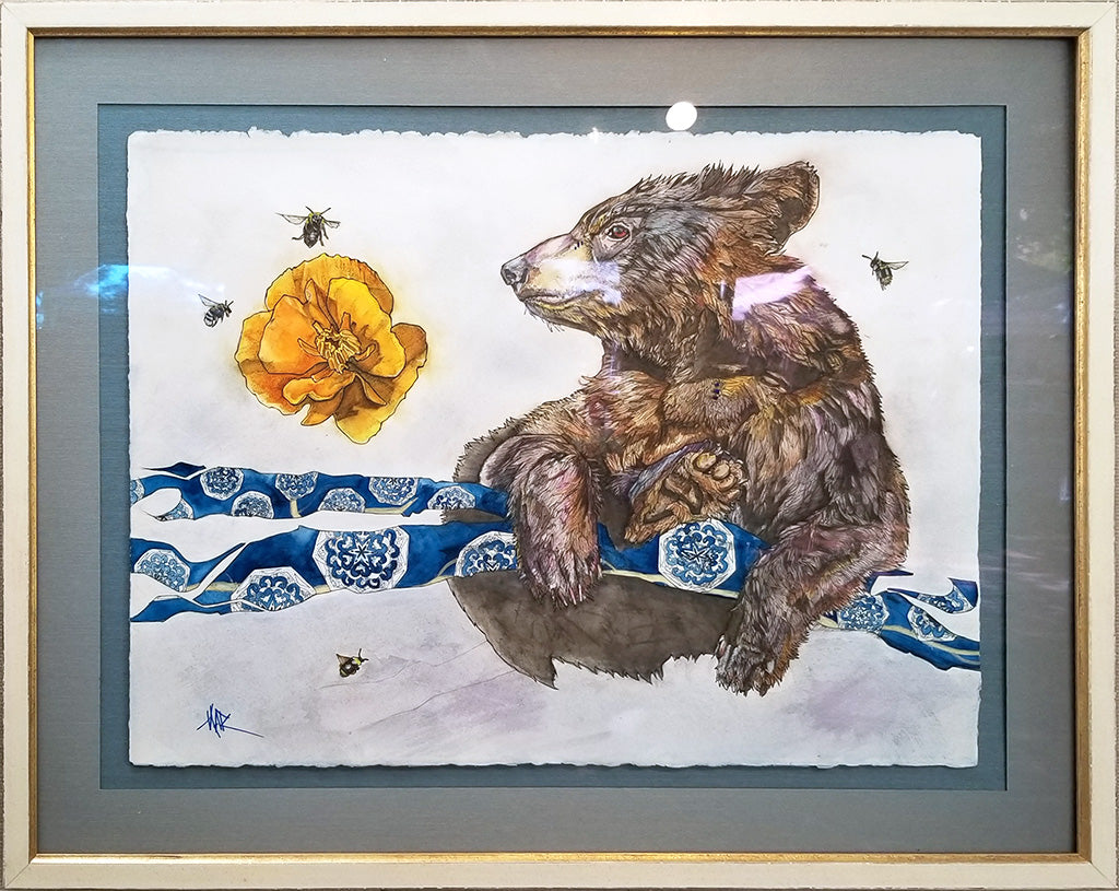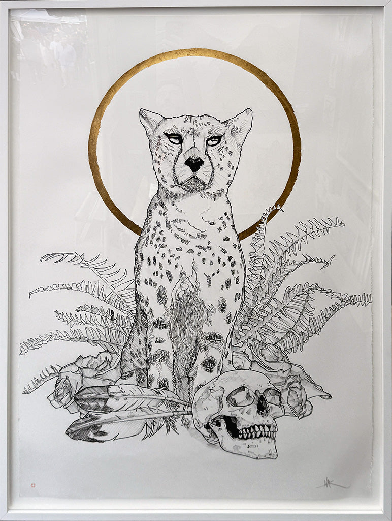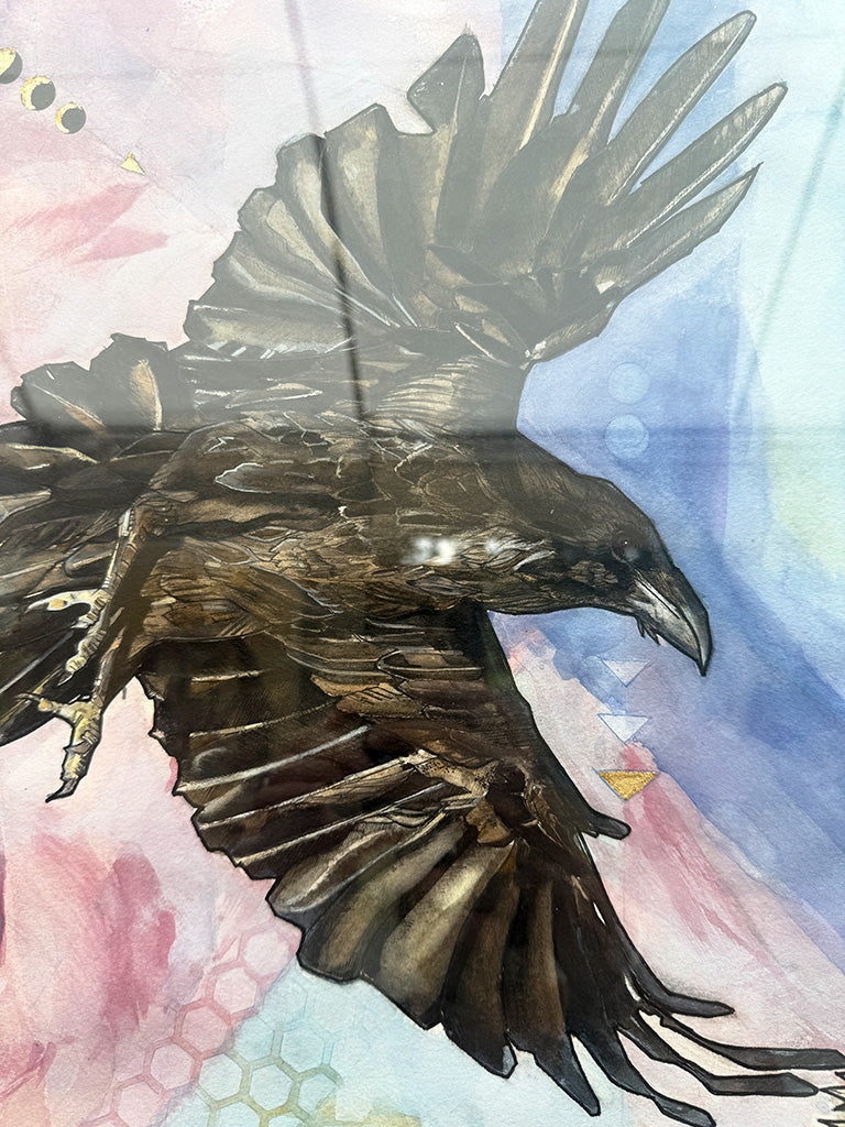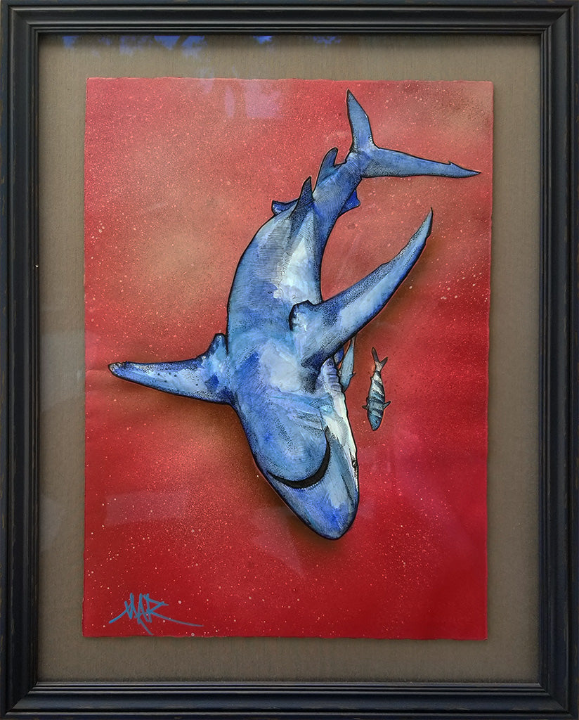Original works are spray varnished then usually float mounted in custom cut frames set behind museum quality glass or acrylic, and sometimes they are flush mounted to a cradled wood panel and displayed with out glass.