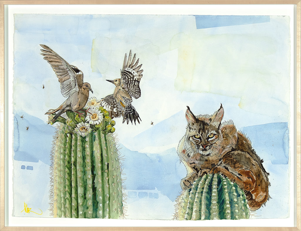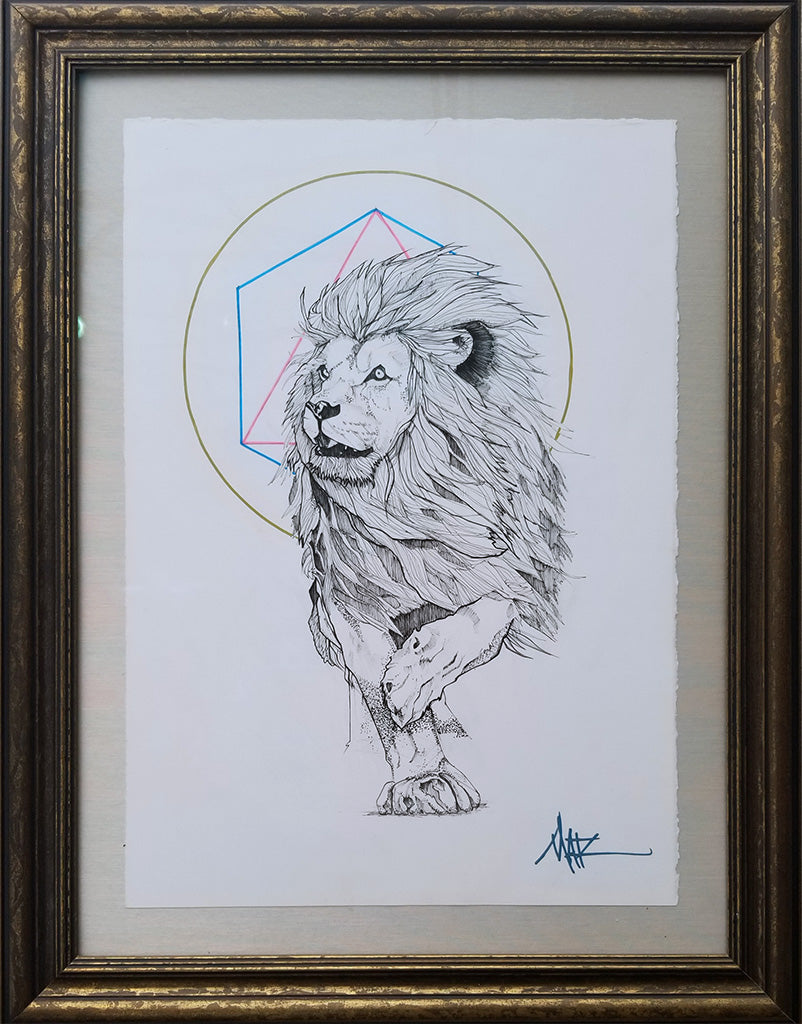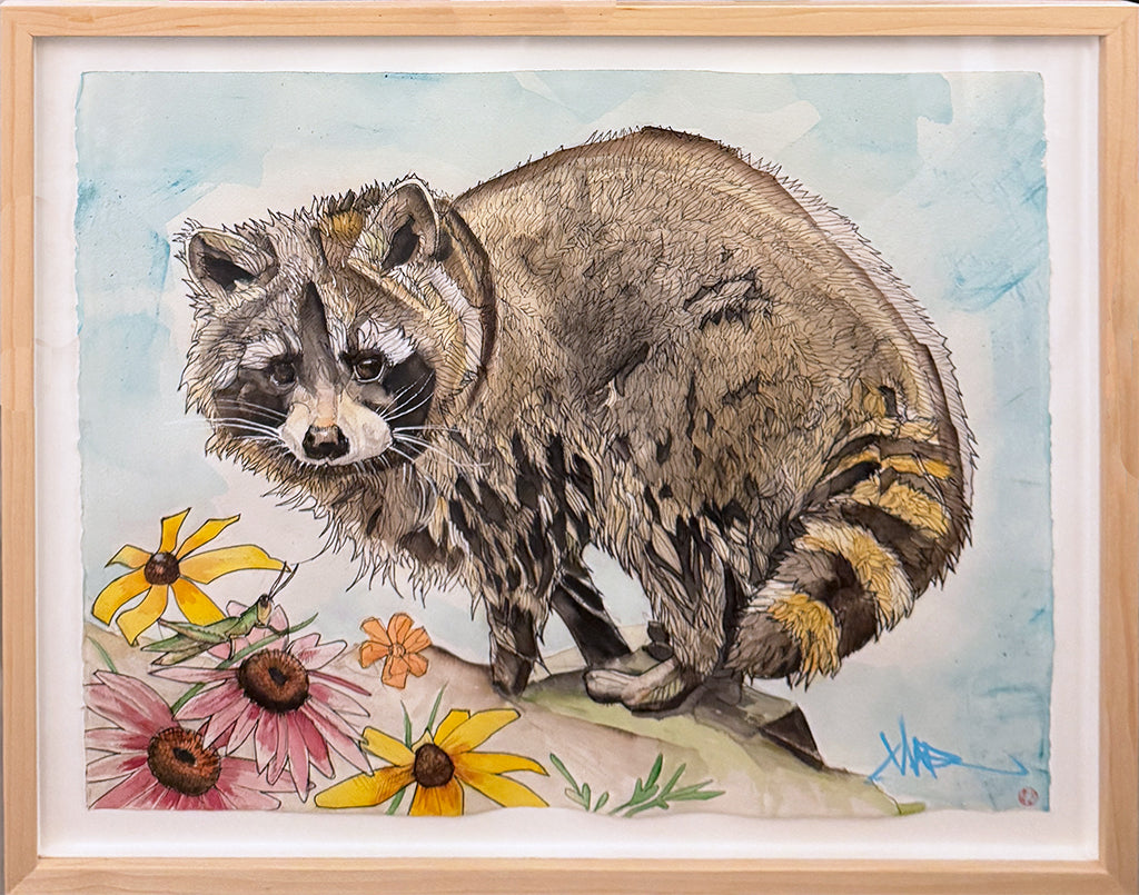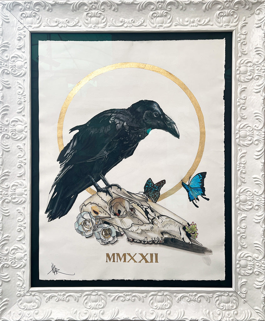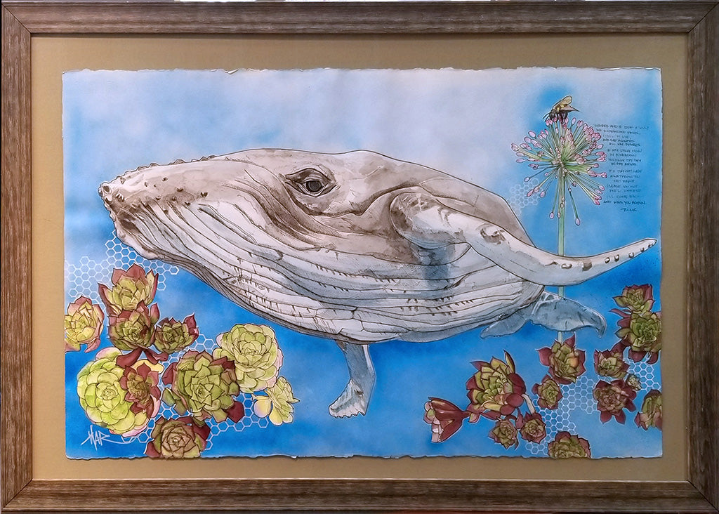 Original works are spray varnished then usually float mounted in custom cut frames set behind museum quality glass or acrylic, and sometimes they are flush mounted to a cradled wood panel and displayed with out glass.