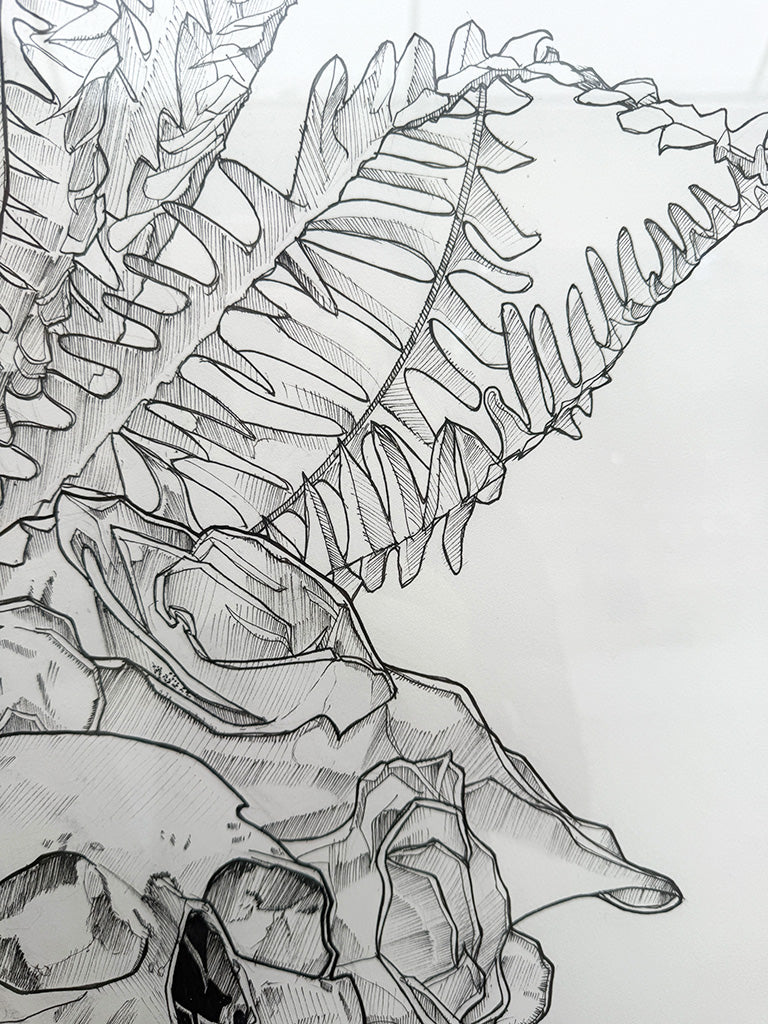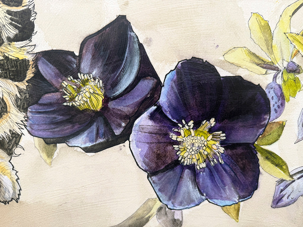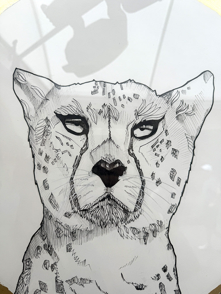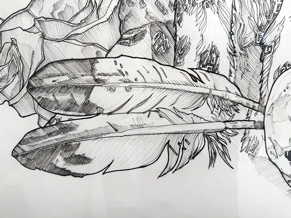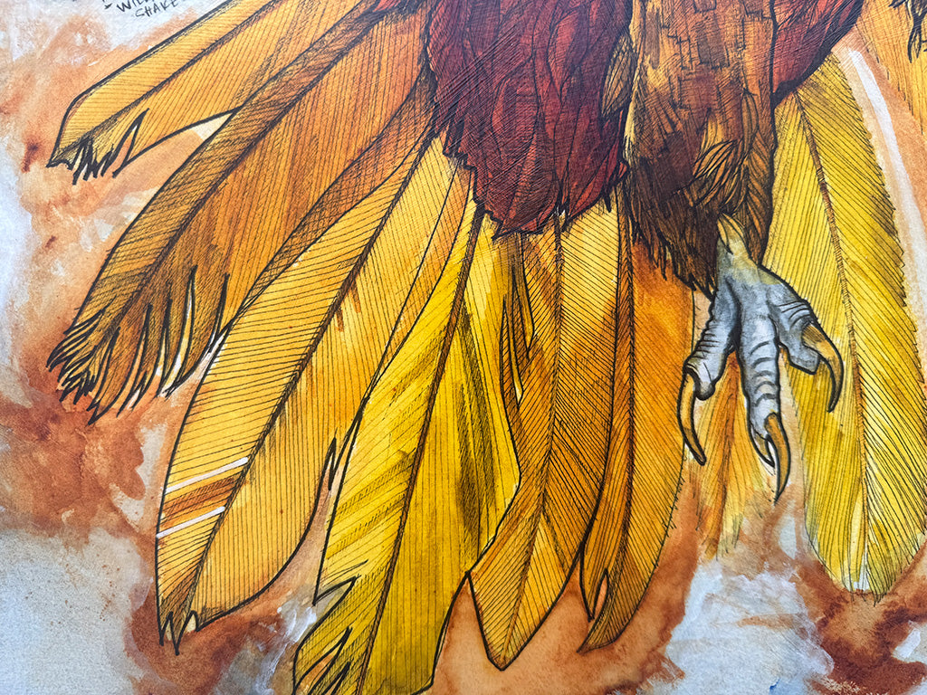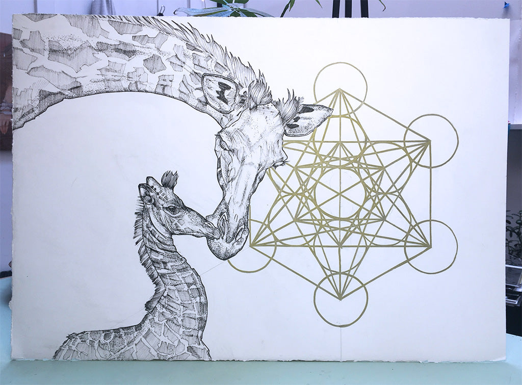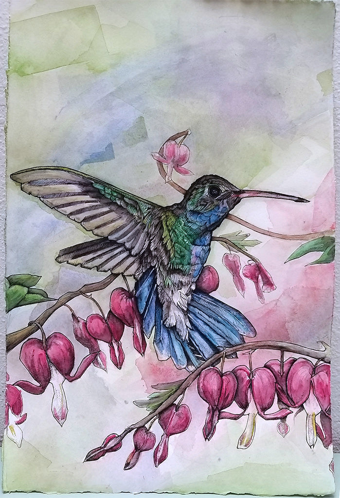 I draw detailed ink illustrations on watercolor paper, then color in with layers of watercolor. In the past, I colored with alcohol-based markers, which I occasionally still employ. Many of the pieces are finished with highlights of gold leaf, acrylic marker, or oil pastel.
