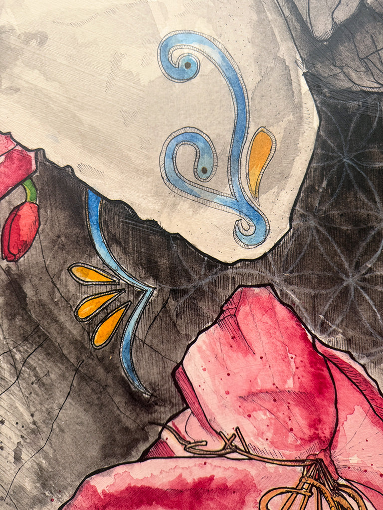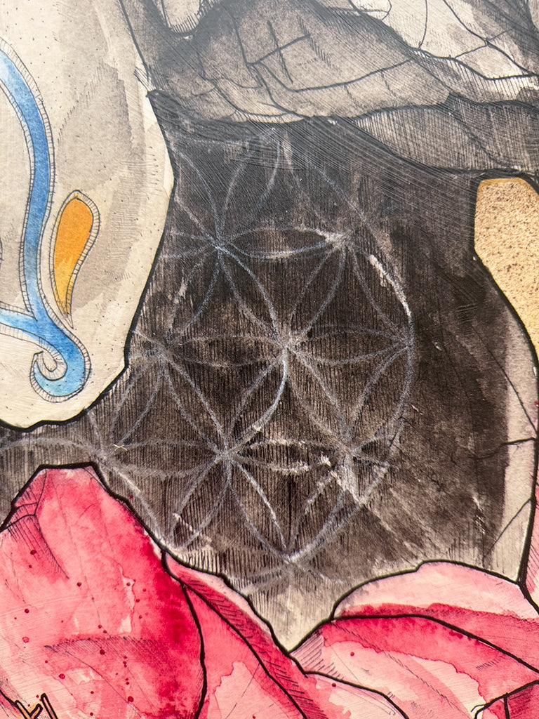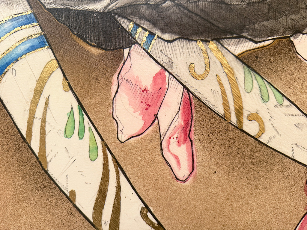 I draw detailed ink illustrations on watercolor paper, then color in with layers of watercolor. In the past, I colored with alcohol-based markers, which I occasionally still employ. Many of the pieces are finished with highlights of gold leaf, acrylic marker, or oil pastel.