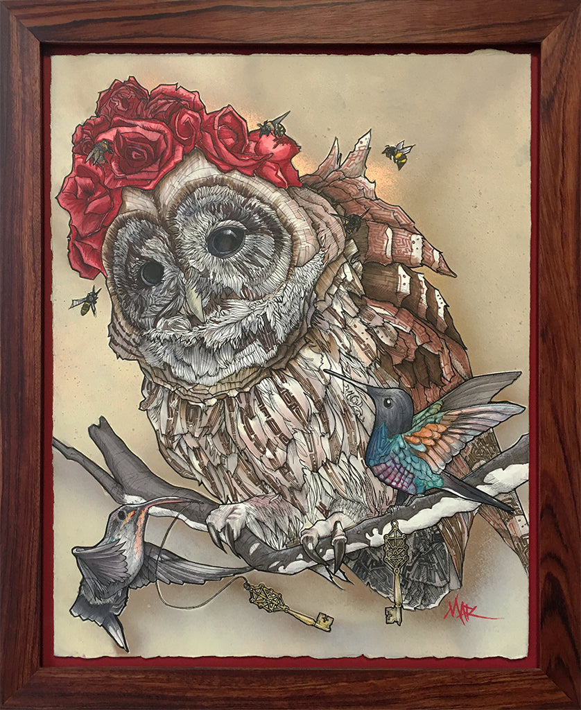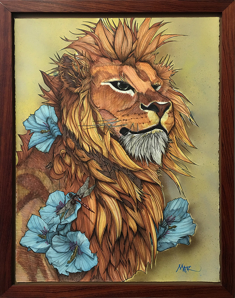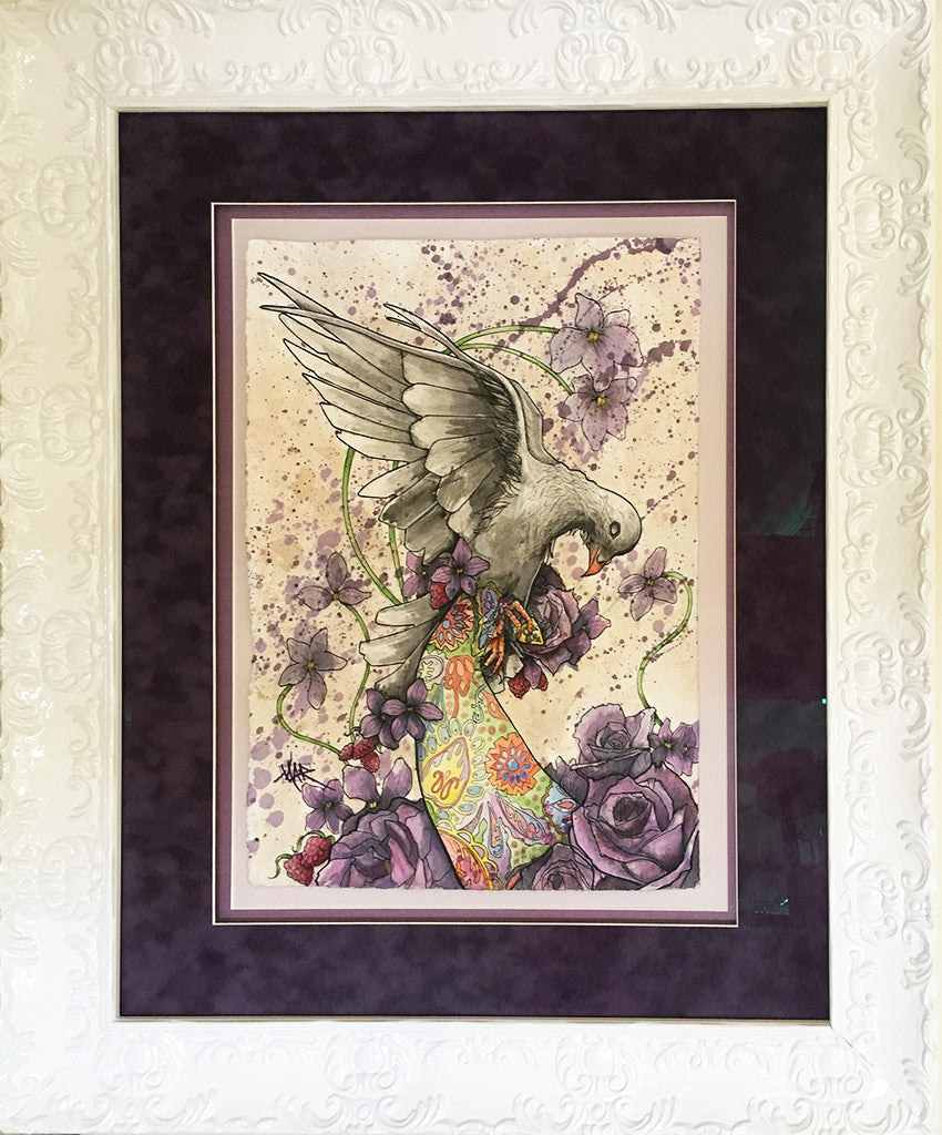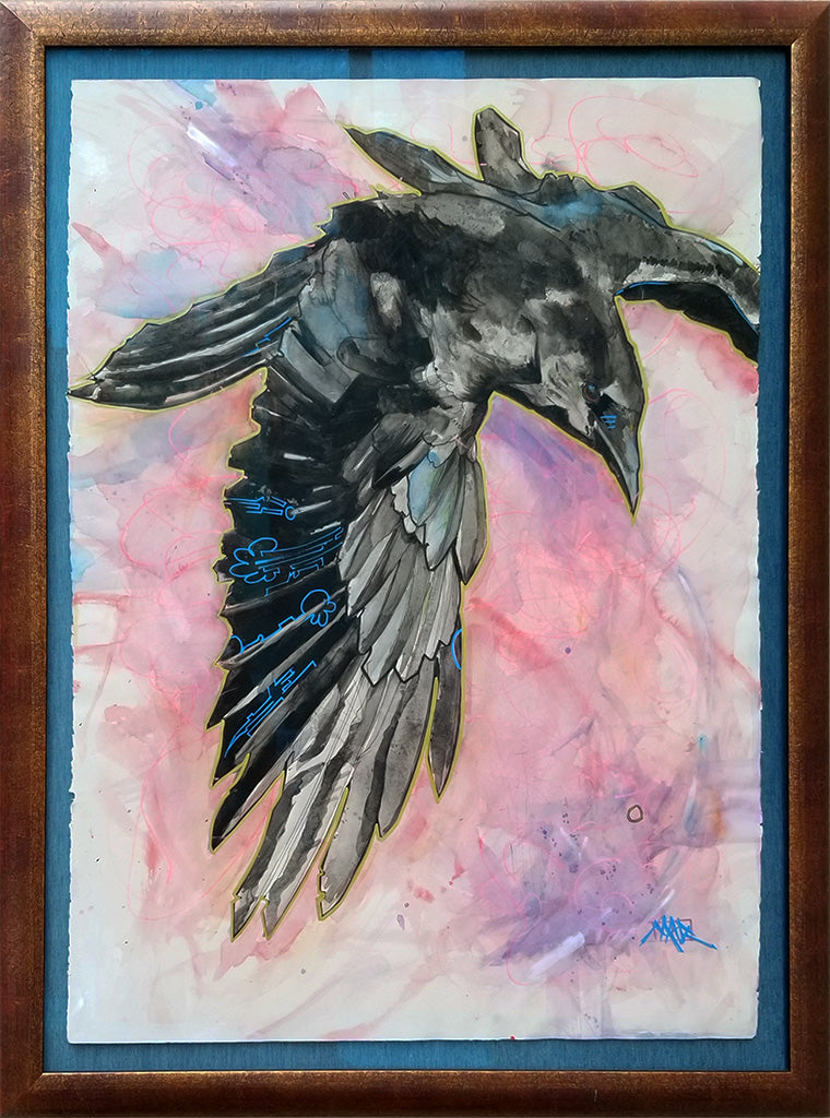 Original works are spray varnished then usually float mounted in custom cut frames set behind museum quality glass or acrylic, and sometimes they are flush mounted to a cradled wood panel and displayed with out glass.