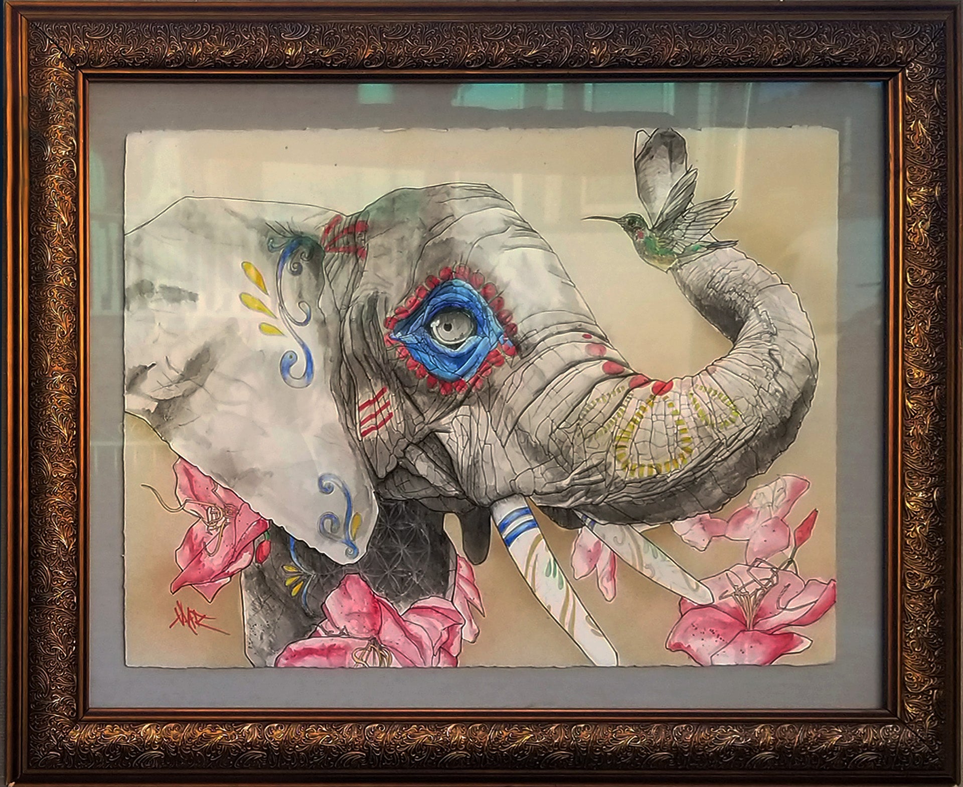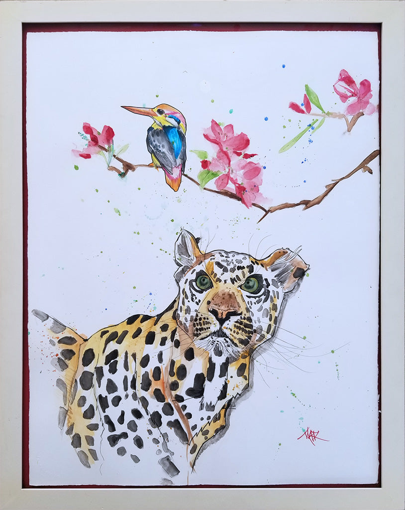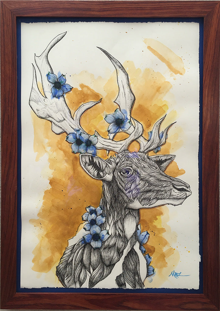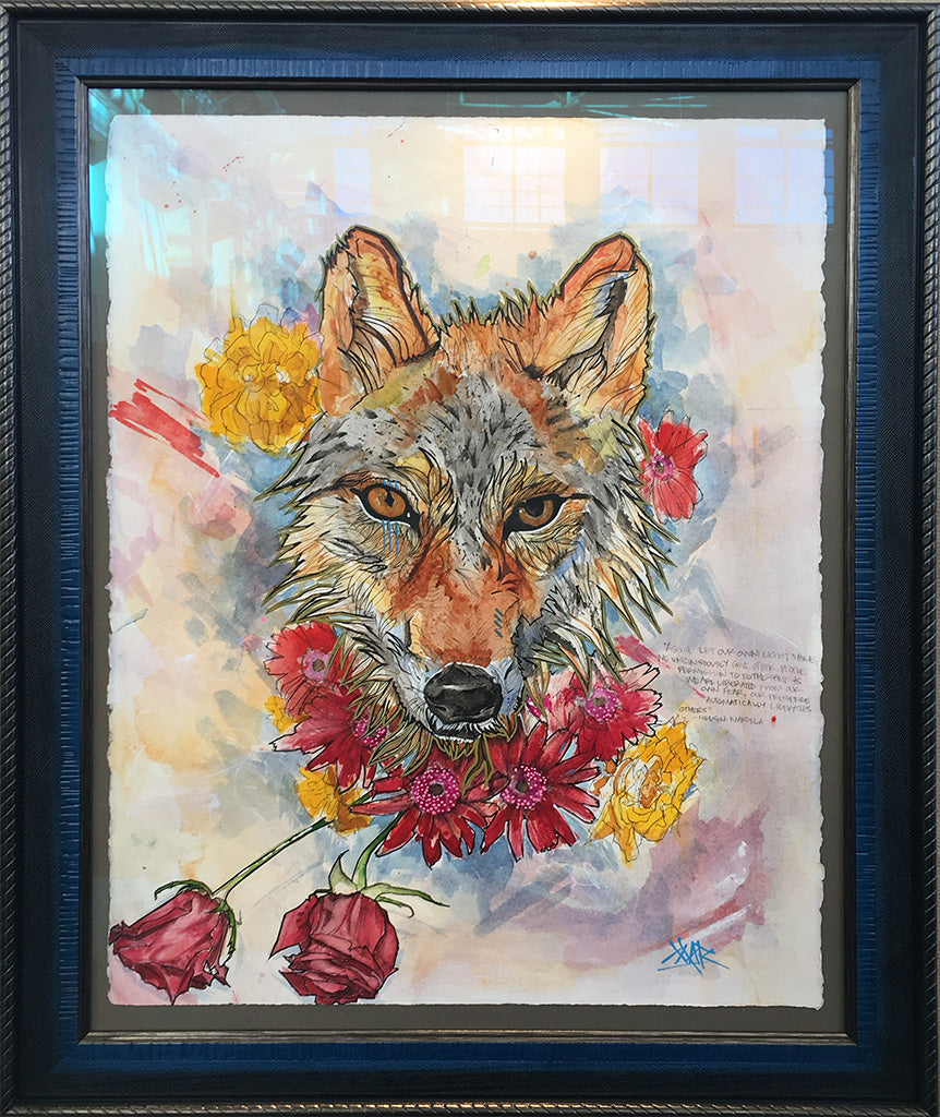 Original works are spray varnished then usually float mounted in custom cut frames set behind museum quality glass or acrylic, and sometimes they are flush mounted to a cradled wood panel and displayed with out glass.