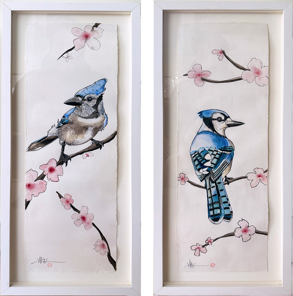 (2025) 10" x 22" each.Ink and watercolor illustration on cold press watercolor paper. Float mounted in a custom cut frame set behind museum quality clear acrylic.